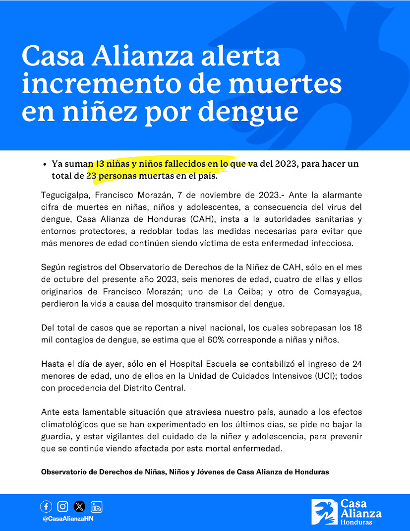 Casa Alianza es una organización humanitaria, apolítica, laica, sin fines de lucro que aboga por la defensa, protección y el cumplimiento de los derechos fundamentales de la niñez y juventud especialmente aquellos que son excluidos por la sociedad, los niños, niñas y adolescentes en desamparo.